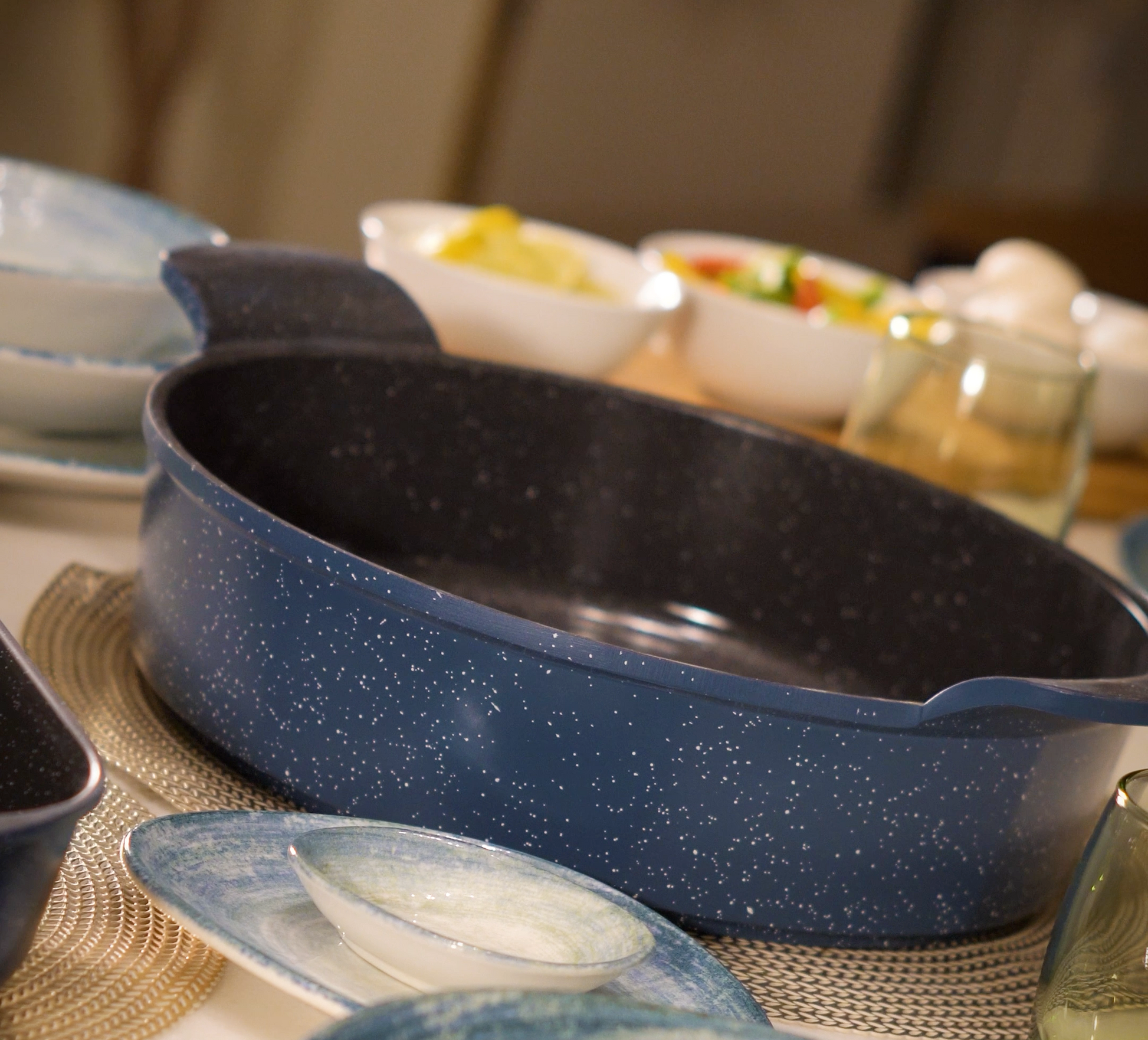 صينية جرانيت غير لاصقة، المصممة لتوزيع الحرارة بالتساوي للحصول على نتائج متقنة في كل مرة. بفضل طبقتها المقاومة للخدش وسهولة التنظيف، أصبحت عملية الطهي أكثر راحة وكفاءة.